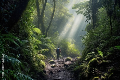 Captivating photo capturing a man hiking in the serene morning light of a beautiful deciduous forest. Generative AI.