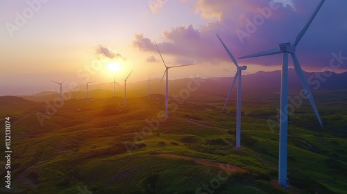 Captivating Sunset Over Wind Turbines in a Lush Landscape