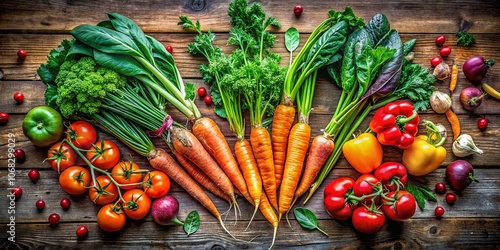 Captivating Surreal Top View of Fresh Organic Vegetables and Lush Greenery on a Rustic Wooden Table, Emphasizing the Nutrition and Health Benefits of Farm-Fresh Produce