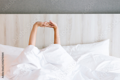 Capture of female arm stretching while waking up on bed.
