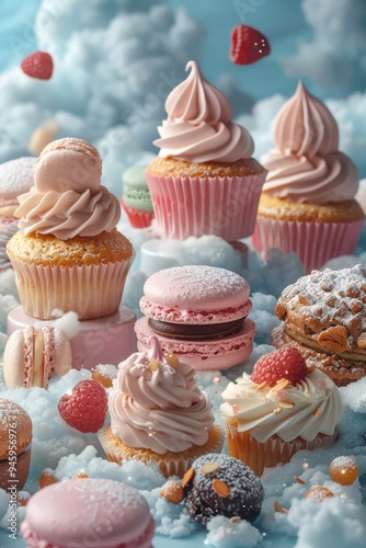 Capture the essence of indulgence with a colorful dessert platter filled with cupcakes, macarons, and more, set against a whimsical backdrop of fluffy clouds