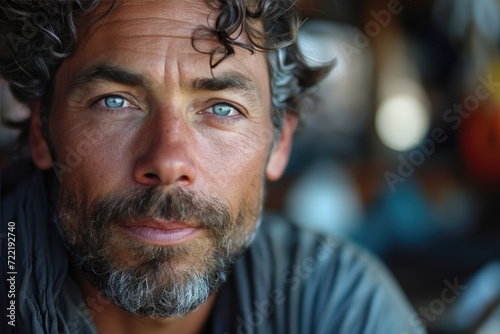 Captured in a stunning portrait, a man's piercing blue eyes and rugged beard exude a sense of strength and character as his facial features are highlighted by the subtle shadows and lines of his face
