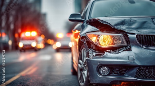 accident, car, crash, collision, damage, emergency, vehicle, traffic, road, insurance, automobile, wreck, destroyed, incident, front, city, street, broken, injured, safety, transportation, auto, rescue, aftermath, metal, headlamp, light, urban, blurred, ambulance, response, crisis, disaster, risk, danger, problem, repair, investigation, police, alert, warning, assistance, exterior, day, grey, cloudy