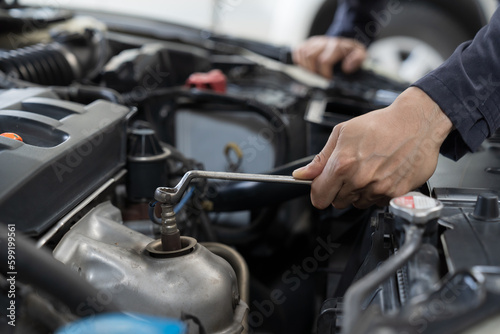 Car mechanic maintenance and auto service shop concept. Male car mechanic repair, fix car engine in auto repair shop. Technician inspecting quality parts of battery, electronic in garage workshop
