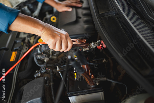 Car mechanic uses a battery jumper cable to charge the dead battery. Car repair service concept.