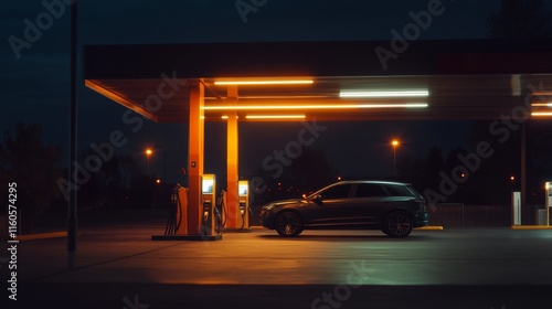 Car parked at a fuel station with a driver checking the fuel level. Featuring bright station lights