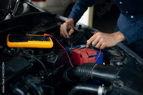 Car service, repair, maintenance concept. Auto mechanic working in garage.