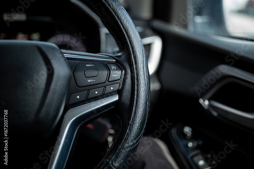 Car steering wheel and car control buttons nearby,Modern car cockpit dashboard close-up. Element of design.