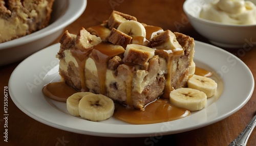 caramel banana bread pudding on a plate