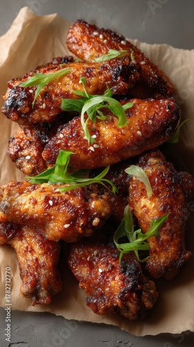 glazed, chicken, wing, scorching, scallion, sesame, parchment, negative, space, spicey, crispy, gold, text, overlay, baked, smoked, served, delicious, savoury, fragrant, rustic, simple, elegant, appetising, tasty, scented, seasoned, garnished, side, dish, ready, modern style