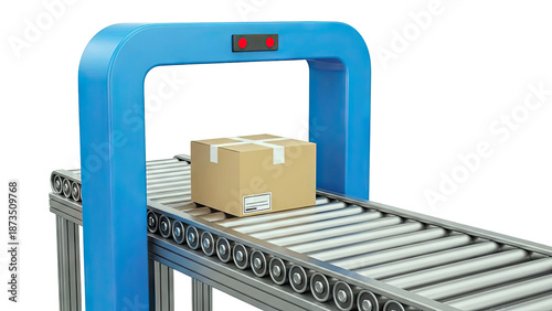 conveyer belt, box, package, cardboard box, transportation, logistic, shipping, manufacturing, factory, warehouse, automation, industrial, machinery, delivery, sorting, system, roller, arch, blue, light, label, tape, movement, good, production, industry, item, cargo, distribution, product, commerce, cardboard box, iso