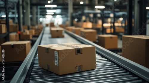Cardboard boxes moving on a conveyor belt in a warehouse for shipping and distribution process