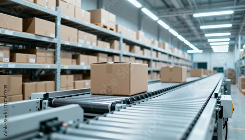 cardboard, conveyer, belt, distribution, warehouse, shipping, delivery, box, package, logistic, industry, storage, stock, product, good, automated, system, supply, chain, commercial, fulfillment, center, interior, indoor, factory, manufacturing, technology, machinery, equipment, move, transportation, export, import, business, order, parcel, shelving, background, perspective