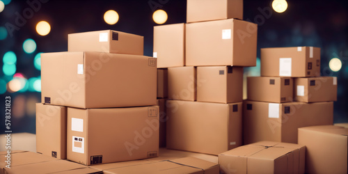 Cardboard boxes on blurred background, logistics and delivery concept. Generative AI