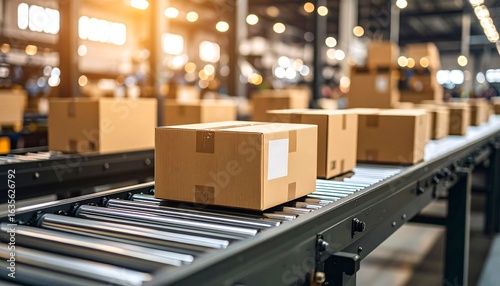 Cardboard boxes on conveyor belt in warehouse