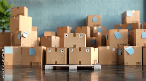 Cardboard boxes on pallet delivery and transportation logistics storage 3d render image.