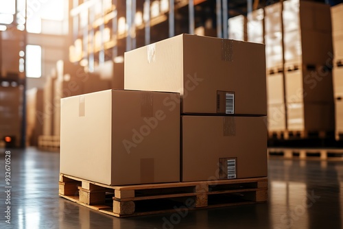 Cardboard boxes on pallet shipping on workshop.
