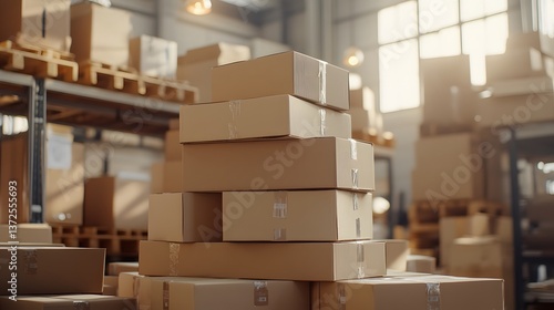 Cardboard Boxes Stacked High in Warehouse Inventory Storage