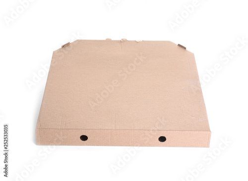 Cardboard pizza box on white background. Mockup for design
