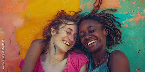 Carefree Spirits: Two young friends laughing together, their heads leaning against each other, their bodies in synchronized motion.