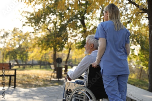 Caregiver assisting senior man on wheelchair in park, back view and space for text. Home health care service