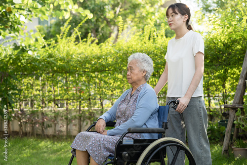 Caregiver help and care Asian senior or elderly old lady woman patient sitting on wheelchair in park, healthy strong medical concept.