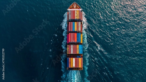 Cargo Colossus: A Bird's-Eye View of a Cargo Ship with Multicolored Containers at Sea