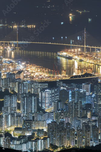Cargo Port and bridge in Hong Kong city at night
