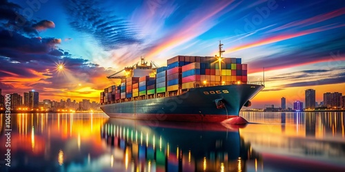 Cargo Ship at Night in Glowing Harbor – Shipping, Transportation, Maritime, Logistics, Global Trade, Night Scene, Harbor Lights, Container Ship, Ocean Freight, Cargo Transportation, Docking