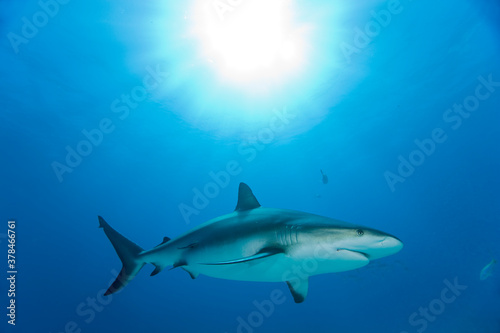 caribbean, bahamas, freeport, horizontal, blue, tropical, shark, underwater, predator, frightening, lurking, aggressive, scarey, circling, danger, dangerous, sunlight, sunbeam, aquatic, nature, wildlife, travel destination, full-length, 1, nobody, no people, day, daytime, daylight, color image