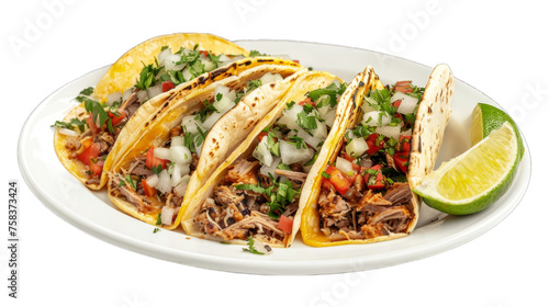 Carnitas Tacos on a plate isolated on transparent png background. Generative ai