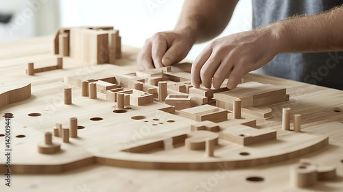 Carpenter assembling wood parts for a table. Featuring attention to detail and craftsmanship