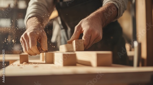 Carpenter assembling wooden shelves in a workshop. Featuring craftsmanship and focus
