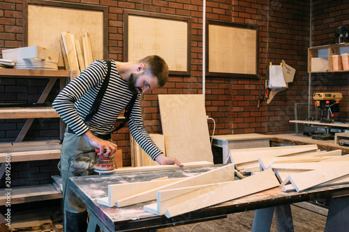 carpenter, work, grinding, wood, occupation, working, holding, control, production, workshop, indoor, looking down, device, technology, craftsman, checking, accuracy, independence, skill, precision, workwear, expertise, grinder, scrutiny, workbench, woodwork, small business, competence, producing, furniture, startup, enterprise, carpenter's shop, young, man, alone, 1, people, caucasian, dark hair, russia, job, craft, woodworker, looking, business, adult