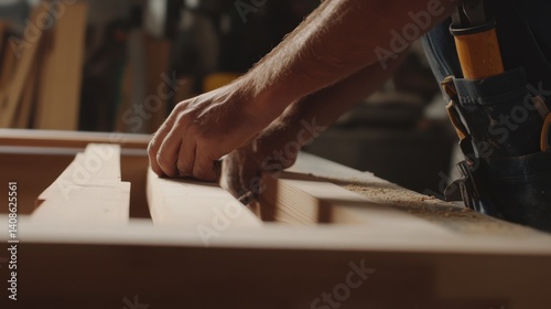 Carpenter installing a window frame at a construction site. Featuring skill and attention to detail