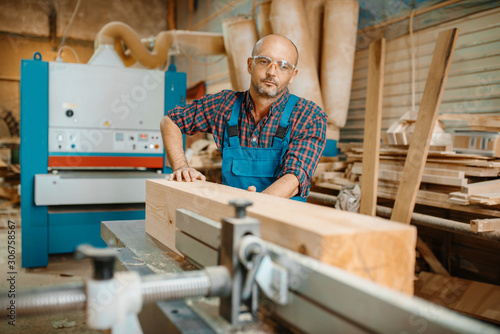 Carpenter processes wooden beam on plane machine