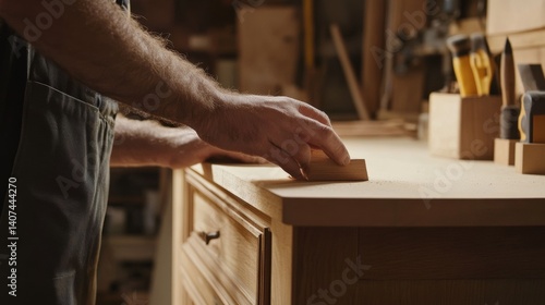 Carpenter sanding a wooden cabinet in a workshop. Featuring precision and craftsmanship