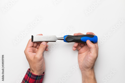 Carpenter's hands Close-up of a man's hands in a plaid shirt on a white background with a chisel, studio shot