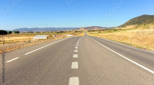 Carretera en la llanura manchega, Castilla la Mancha, España