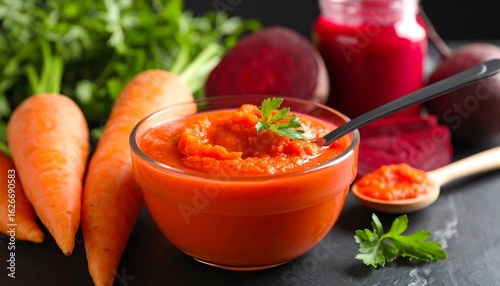 carrot, beet, vegetable, food, healthy, baby, dish, bowl, spoon, fresh, organic, nourishment, smoothie, food photography, natural, ingredient, closeup, delicious, vitamin, texture, smooth, vibrant, orange, red, dark, background, glasses, wooden, parsley, health food, baby food, alimentary, homemade, simple, tasty, colourful, appetising, diet, vegan, vegetarian, children, lunch, snack