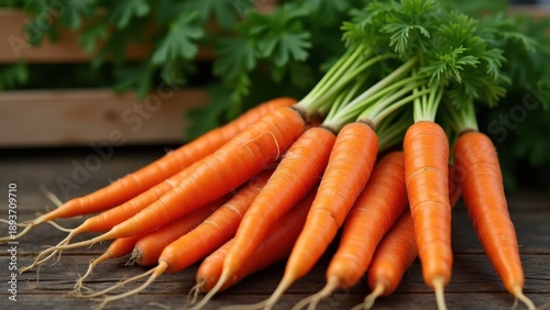 Carrot bunch fresh picked, green leafy tops, wooden crate background, farm fresh vegetables, organic produce theme