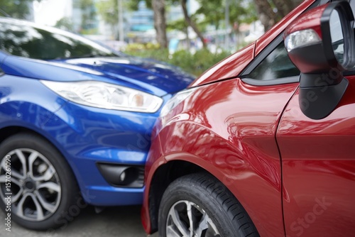 car, accident, crash, collide, left, side, vehicle, transportation, automotive, parking, automobile, auto, road, traffic, city, modern, hit, touch, catch, strike, bump, next, blue, red, business, travel, light, row, street, background, line, new, shiny, view, motor, technology, luxury, highway, urban, wheel, rear, place, natural, lifestyle, asphalt, diversity, illustration, advertisement, advertisement