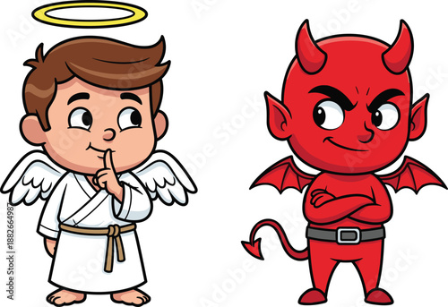 Cartoon angel and devil kids characters, good versus evil concept, moral choice illustration, cute vector design