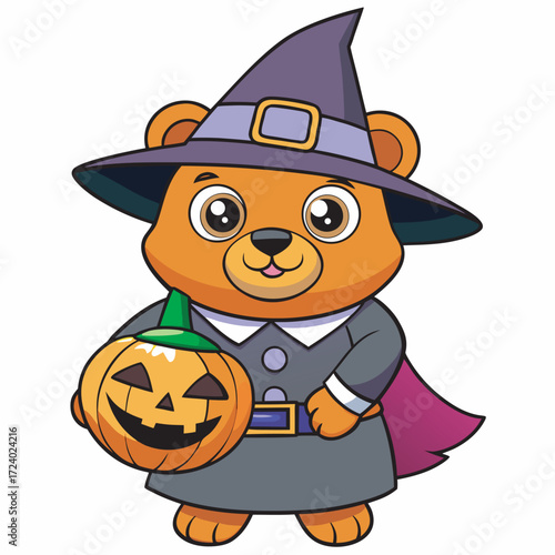 Cartoon bear dressed as a witch holding a carved pumpkin