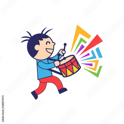 cartoon, boy, drum, music, play, children, illustration, cheerful, happy, geometric, shape, burst, colourful, red, yellow, blue, green, purple, white, background, celebration, entertainment, musical, performance, children, graphic, design, clip art, drawing, art, joy, rythm, sound, band, musical instrument, drummer, vibrant, festive, party, fun, dynamic, youth, mascot, icon, symbol, character, animation, playful