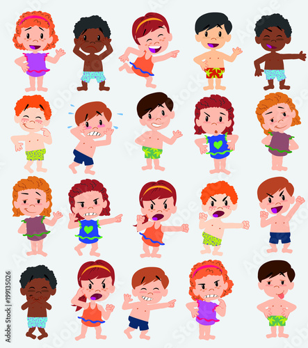 Cartoon character boys and girls in a swimsuit. Set with different postures, attitudes and poses, doing different activities. Vector illustrations.