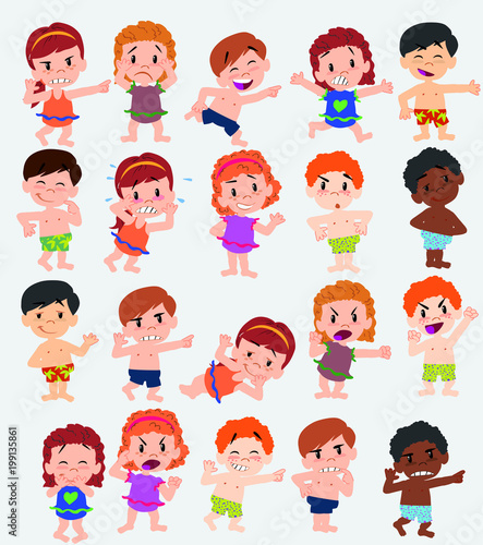 Cartoon character boys and girls in a swimsuit. Set with different postures, attitudes and poses, doing different activities. Vector illustrations.
