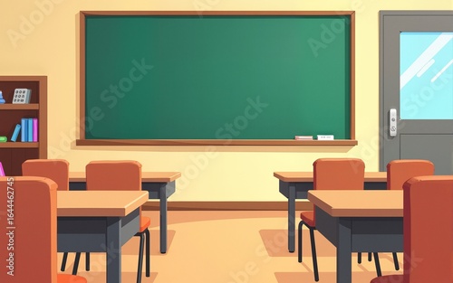 Cartoon classroom interior with view on blackboard, school desks with chairs, bookcase, door and window. Flat Vector Illustration. High quality