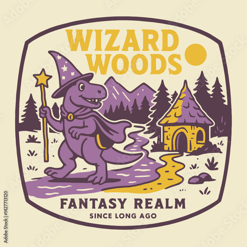 dinosaur, magician, walking, wearing, hat, cape, holding, wand, star, cartoon, illustration, fantasy, wood, forest, tree, pine, house, small, tiny, building, path, sun, mountain, landscape, drawing, vector, graphic, design, vintage, retro, badge, sticker, purple, yellow, art, artwork, scene, nature, concept