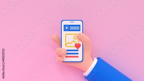 Cartoon human hand with smartphone and social network profile. 3d render illustration.